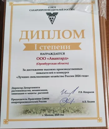 ООО «Авангард» Абдулинского муниципального округа награждено Дипломом I степени как лучшее свеклосеющее хозяйство России в 2024 году.
